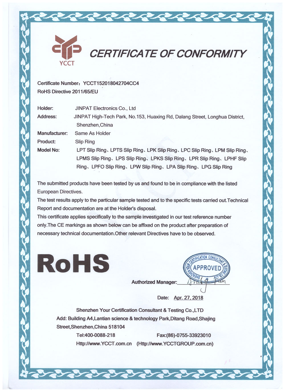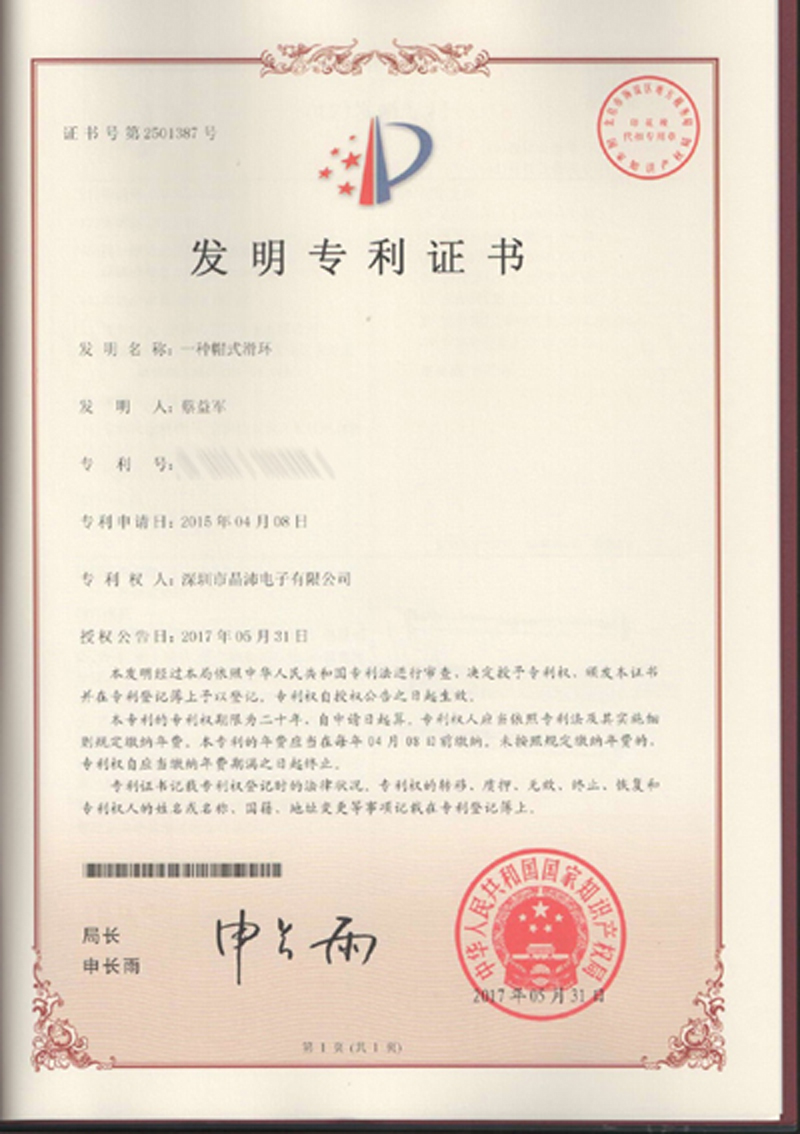 晶沛通過(guò)了歐盟CE認(rèn)證聊胜于无、FCC認(rèn)證抓耳挠腮、SGS認(rèn)證风景如画、BV“船級(jí)社”認(rèn)證、防爆認(rèn)證等多項(xiàng)認(rèn)證,生產(chǎn)的導(dǎo)電滑環(huán)都符合RoHS環(huán)保要求,先后被授予“國(guó)家高新技術(shù)企業(yè)”稱(chēng)號(hào),目前已獲得45項(xiàng)專(zhuān)利,其中發(fā)明專(zhuān)利6項(xiàng)。